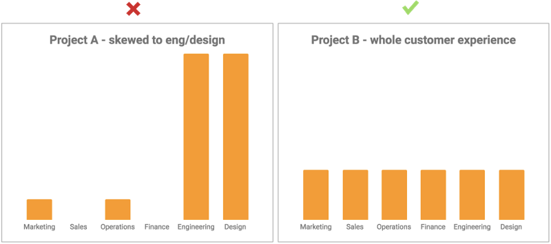In short — it’s not just the product, it’s everything around it, too. Take a look at two different projects a PM could take on, represented by the diversity of functional skill that is required from the project, below.
