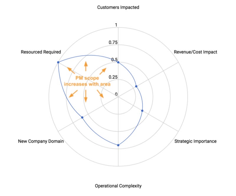 You can visualize the scope that you’re giving a PM for a particular project by plotting the dimensions of the project as per the chart below, with 0 being no complexity and 1 being maximum complexity for each . The total difficulty is the area plotted.
